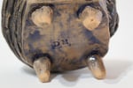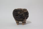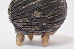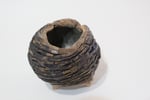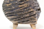 La superficie è attraversata da solchi, creste e variazioni cromatiche che evocano paesaggi geologici e processi naturali di sedimentazione. Le tonalità terrose, arricchite da accenti smaltati, creano un equilibrio tra ruvidità e lucentezza. La forma poggia su piccoli sostegni che conferiscono stabilità e un carattere scultoreo.