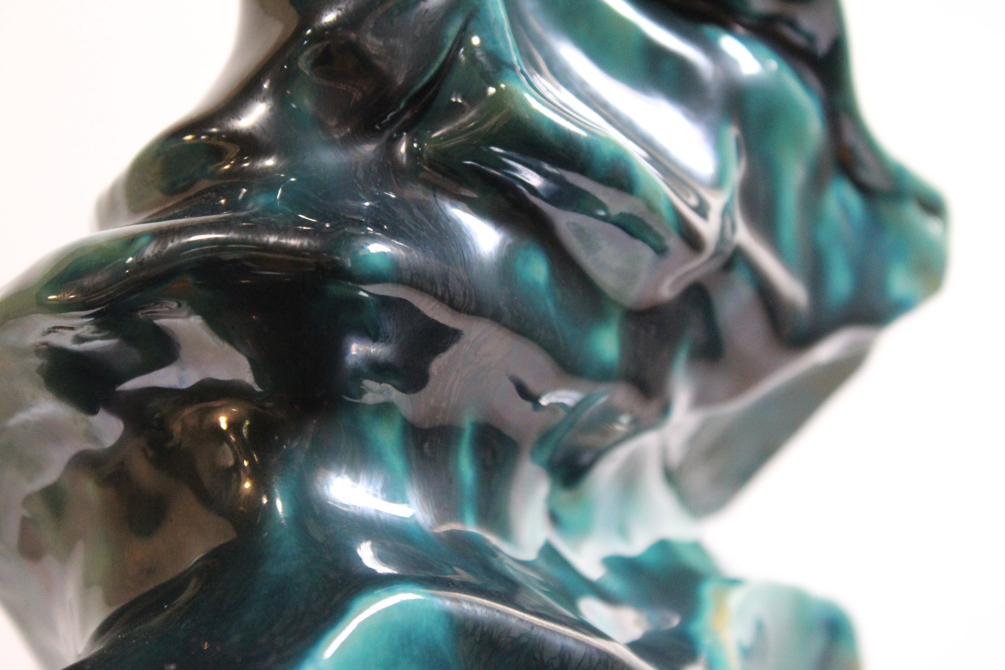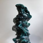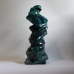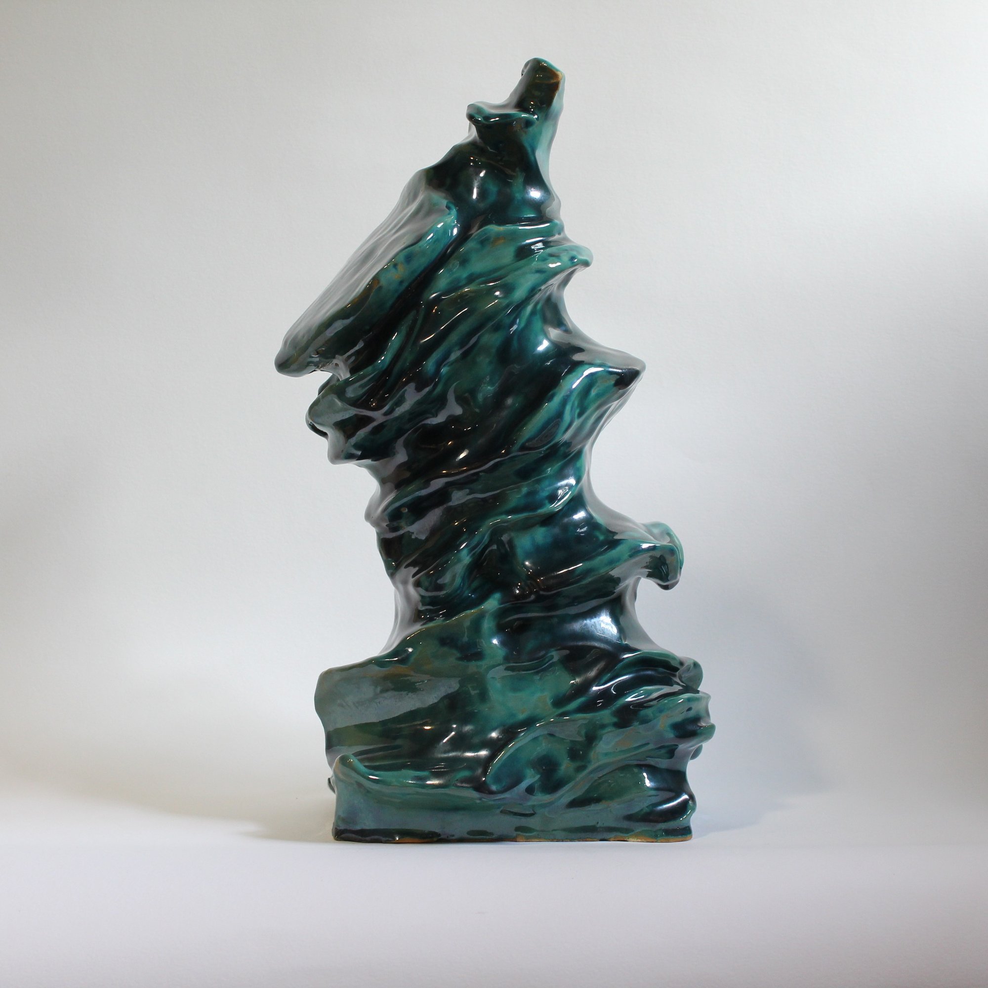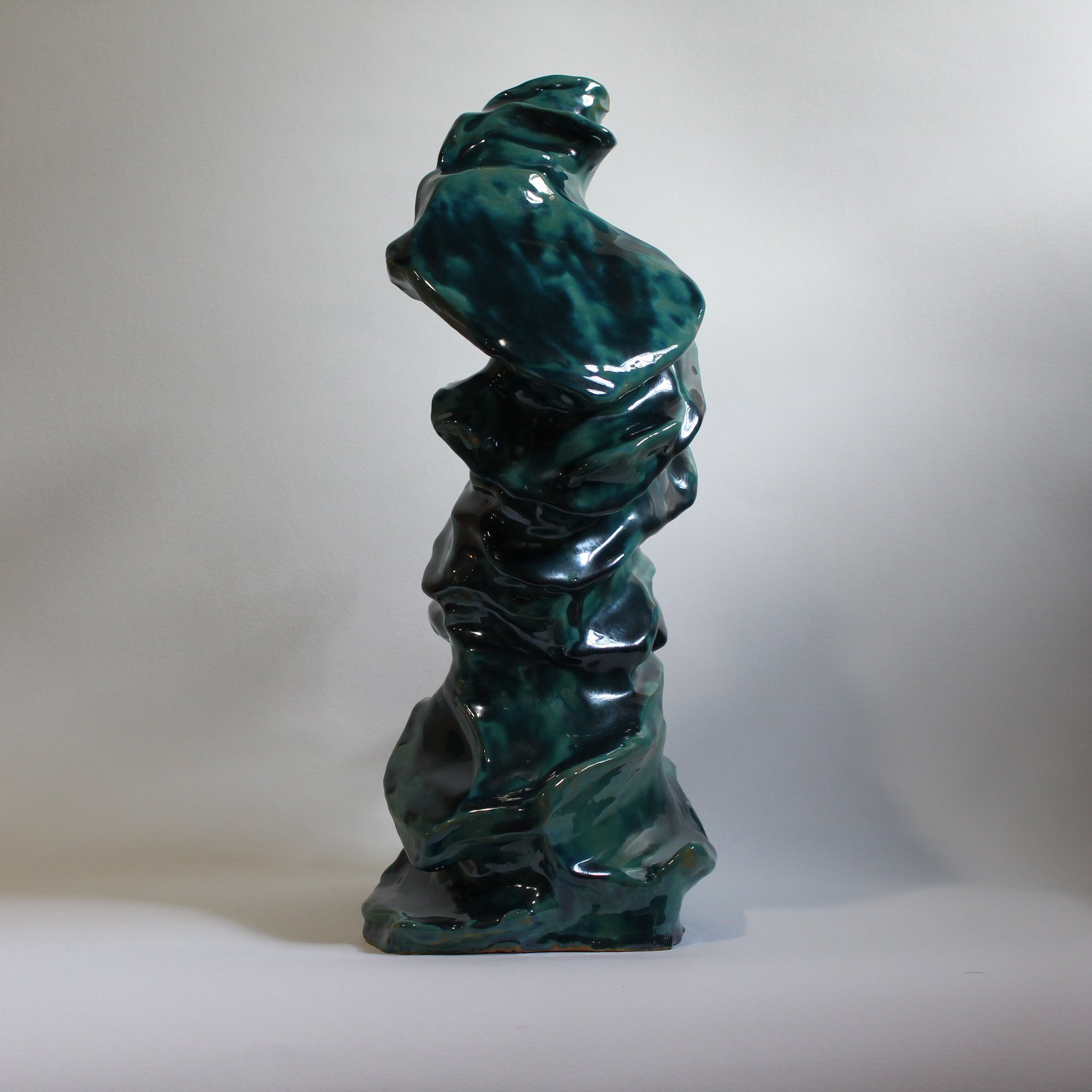 Questa scultura in ceramica verde rame (35 × 20 × 15 cm) nasce da una ricerca formale che unisce gesto, fluidità e tensione materica. Le superfici creano un gioco di riflessi che muta con la luce, mettendo in risalto le pieghe e le tensioni dell’opera. La forma, organica e dinamica, richiama movimenti naturali — correnti, stratificazioni, forze in espansione — trasformati in un oggetto solido e meditativo.