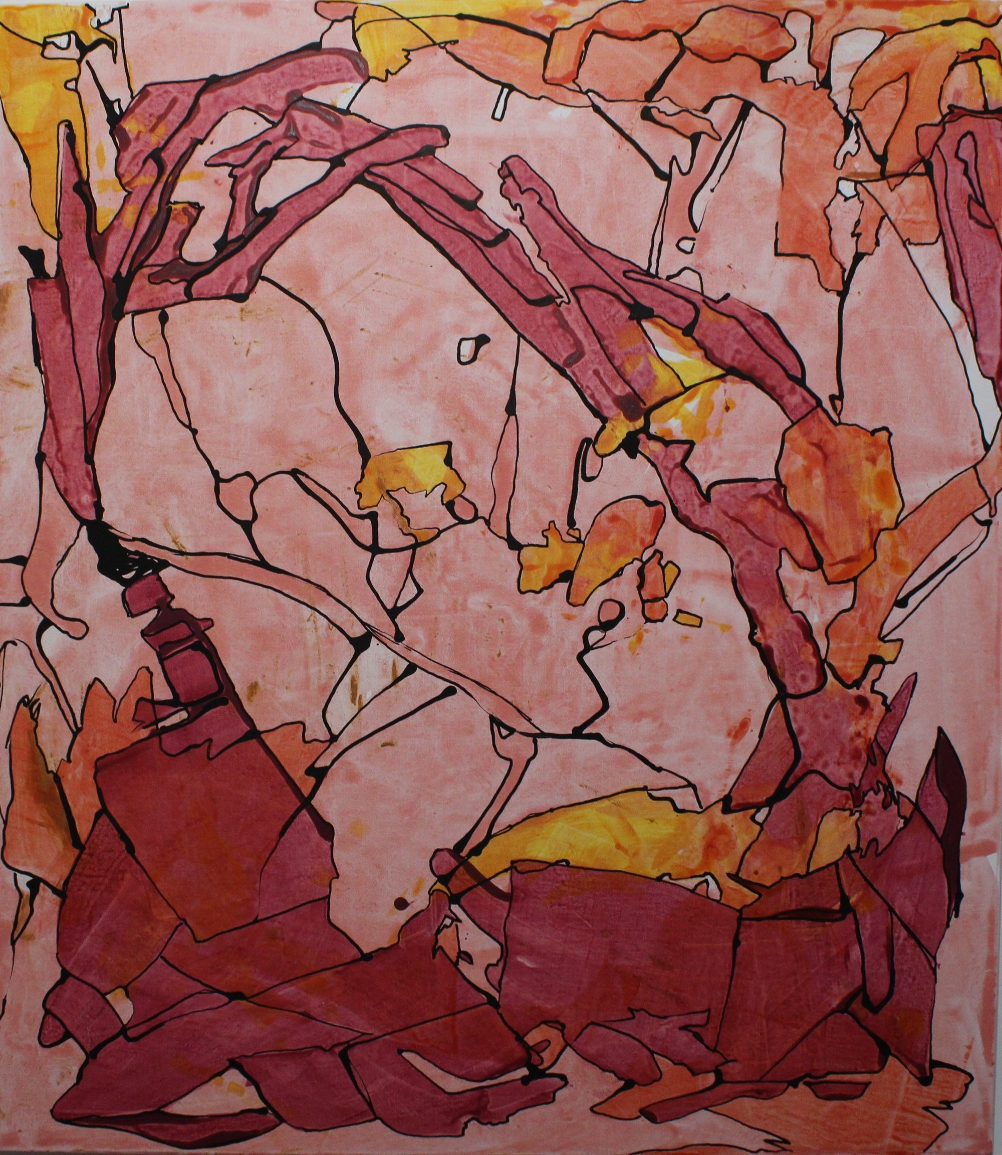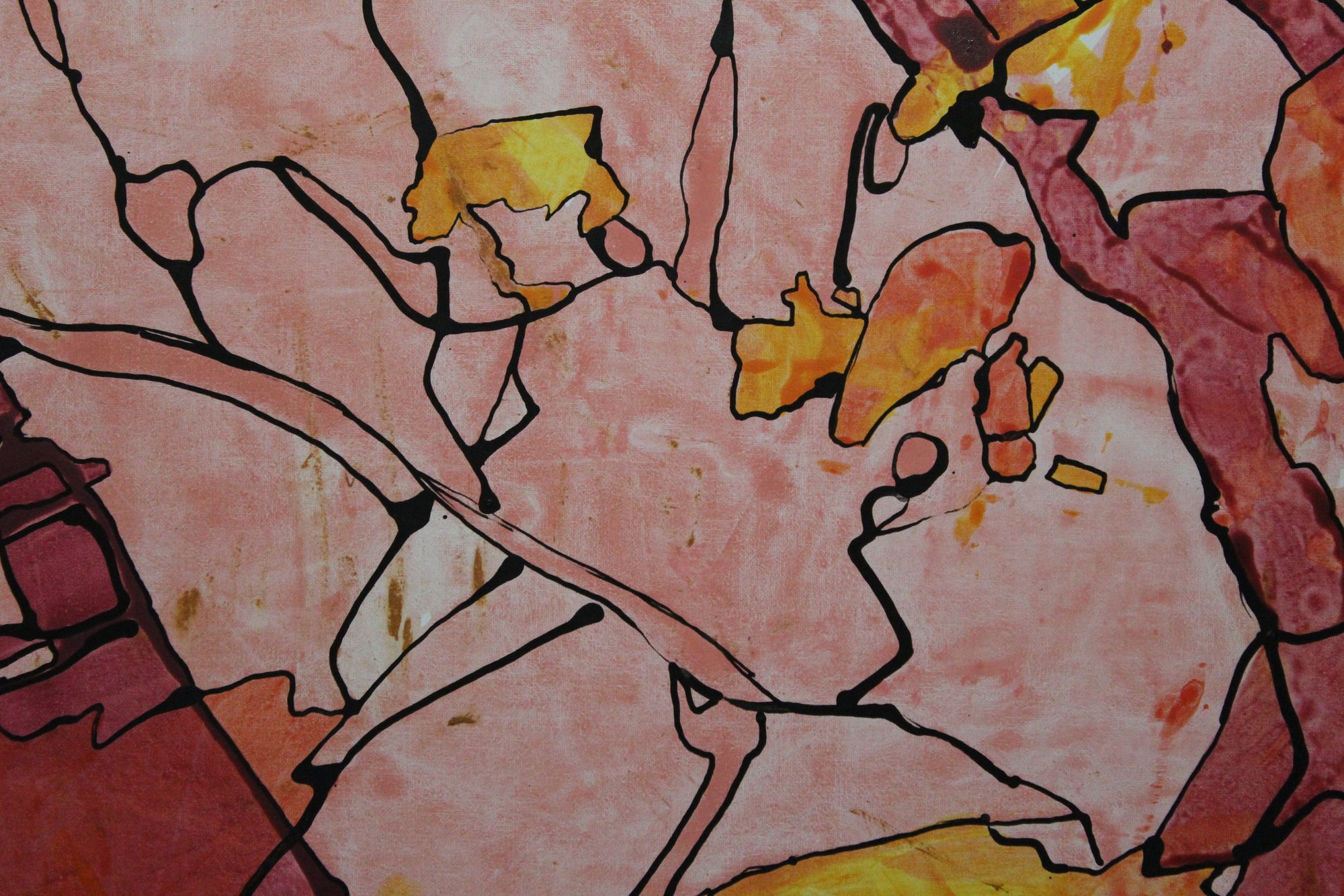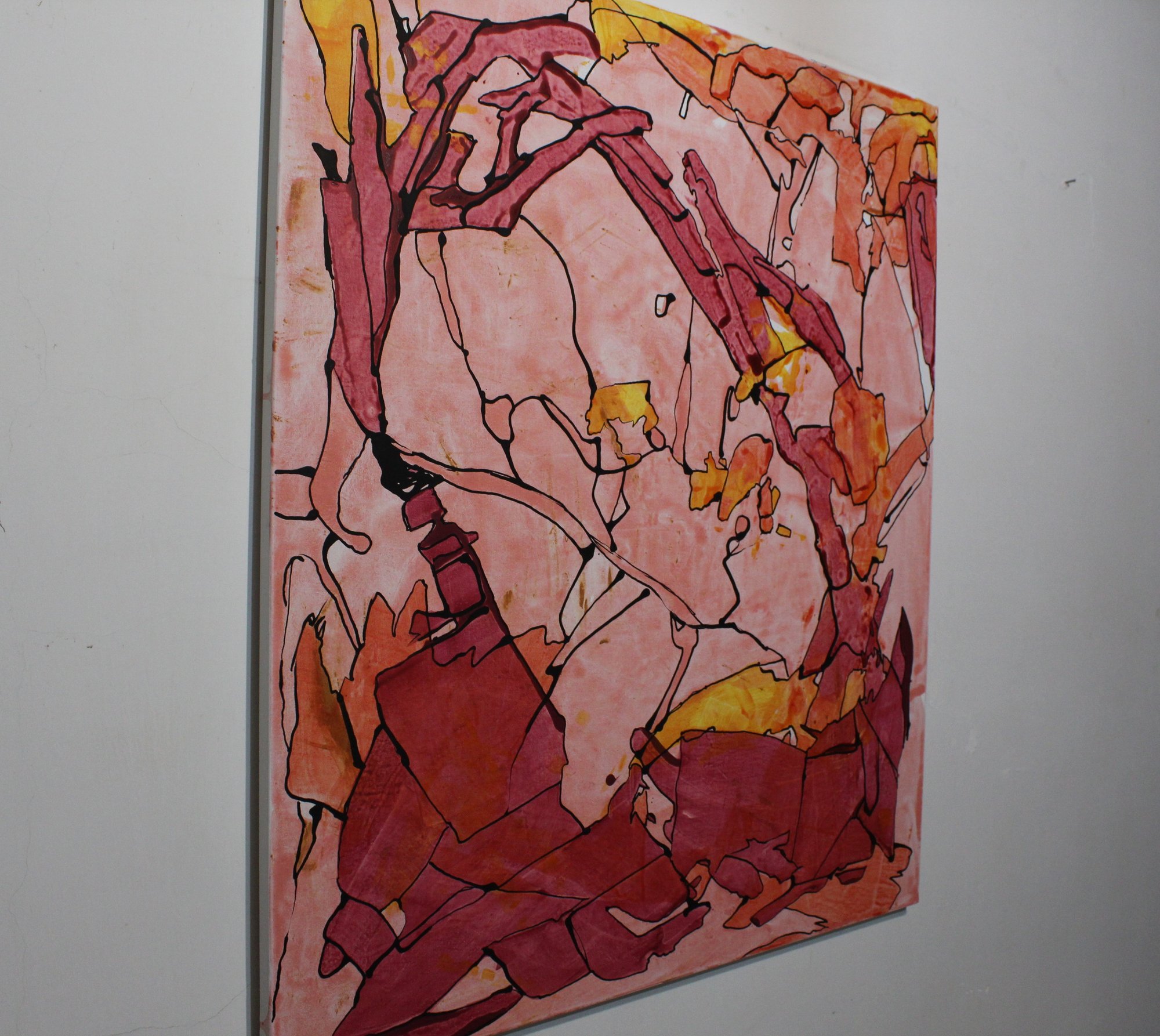 Frammento 01 è un viaggio in una geografia interiore. Le forme si intersecano come tessere di un mosaico dimenticato, delineate da trame nere che evocano confini, nervature, mappe. I toni rossi, aranciati e rosati si accendono e si dissolvono in un ritmo cromatico che suggerisce movimento, trasformazione, memoria.