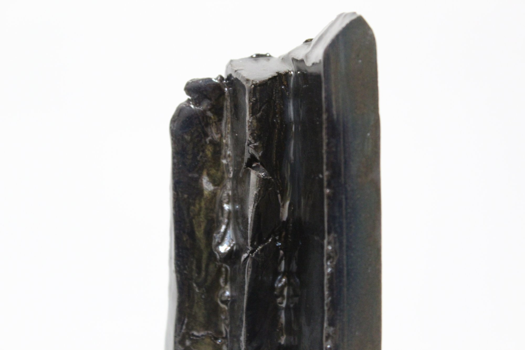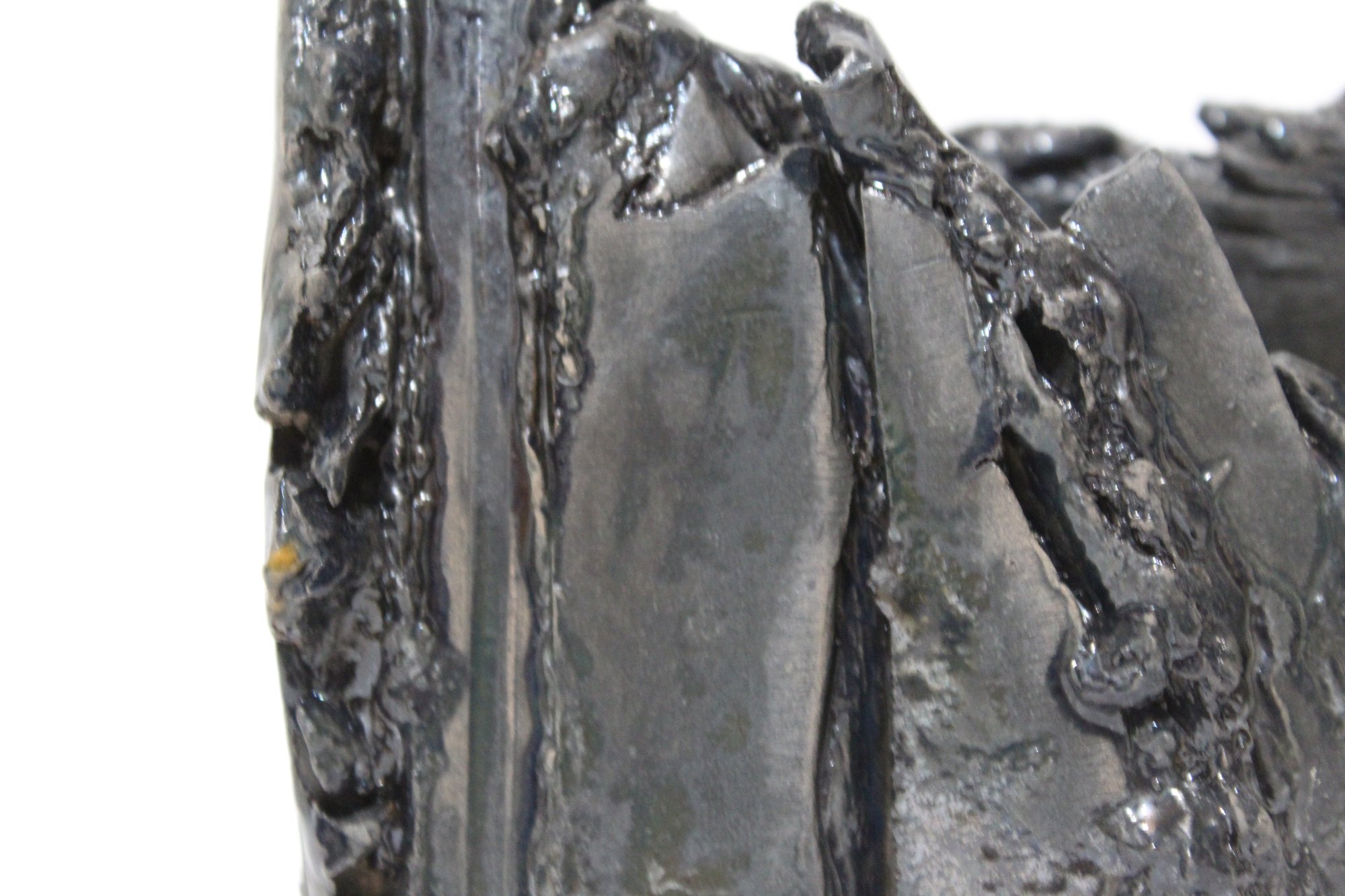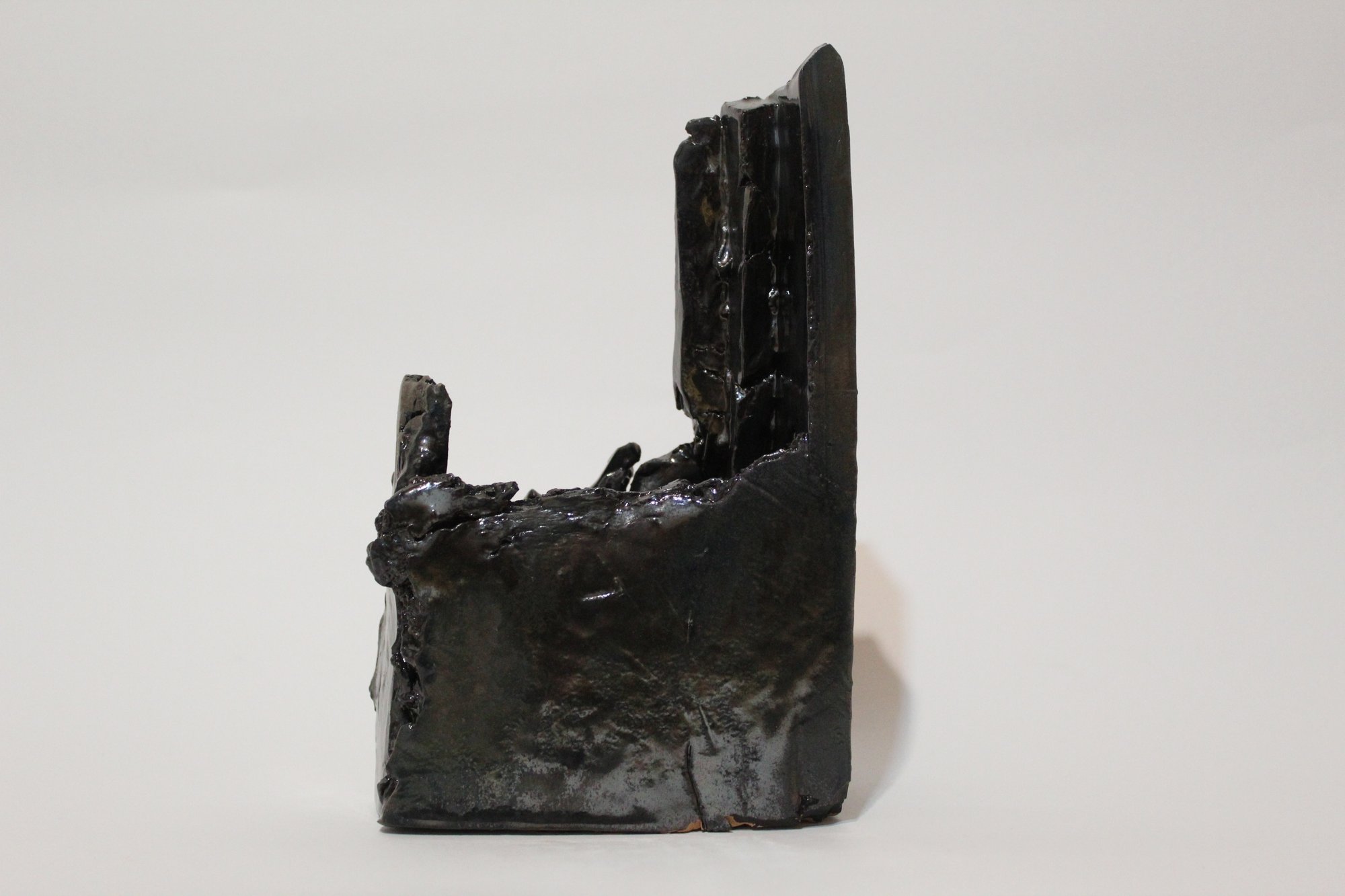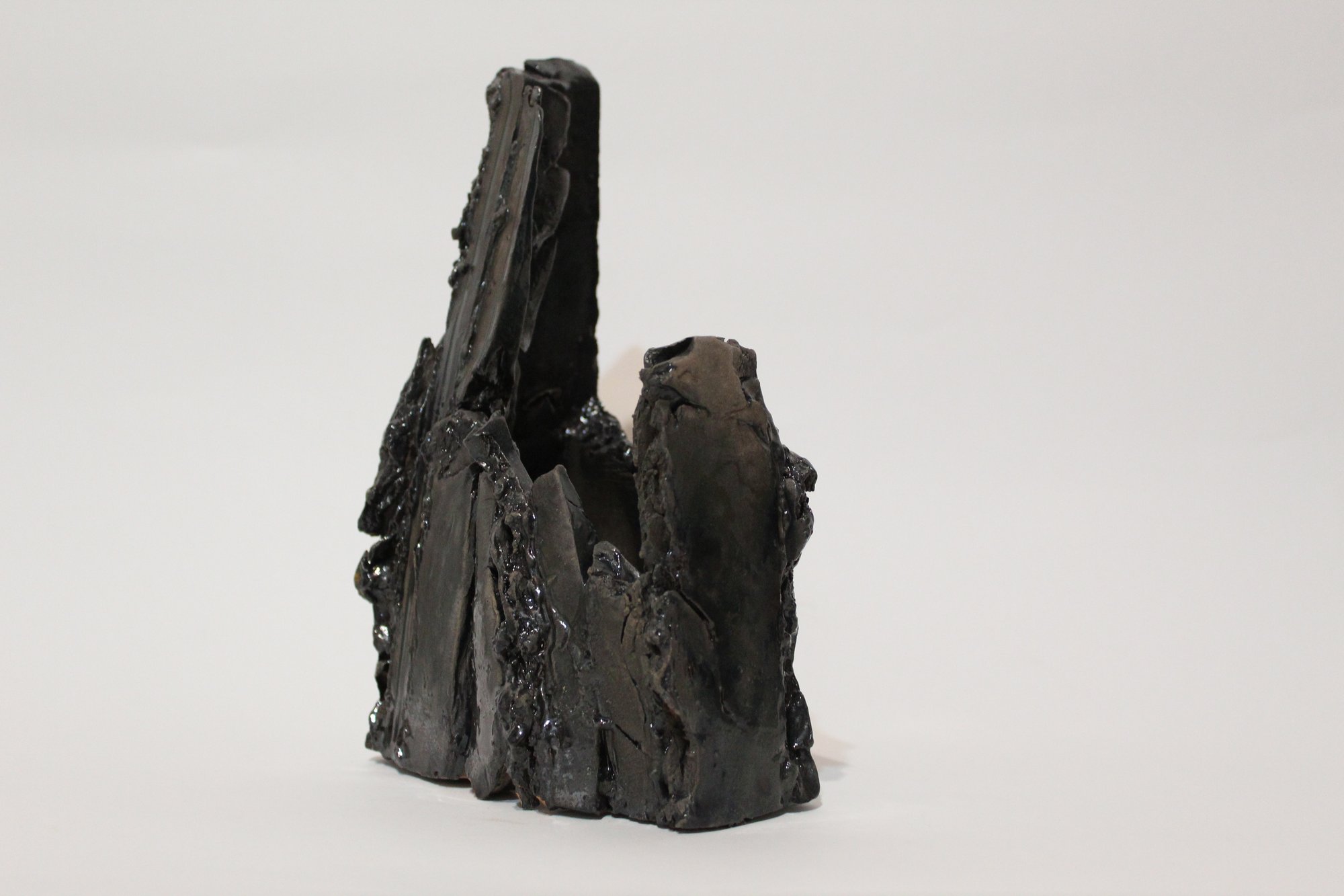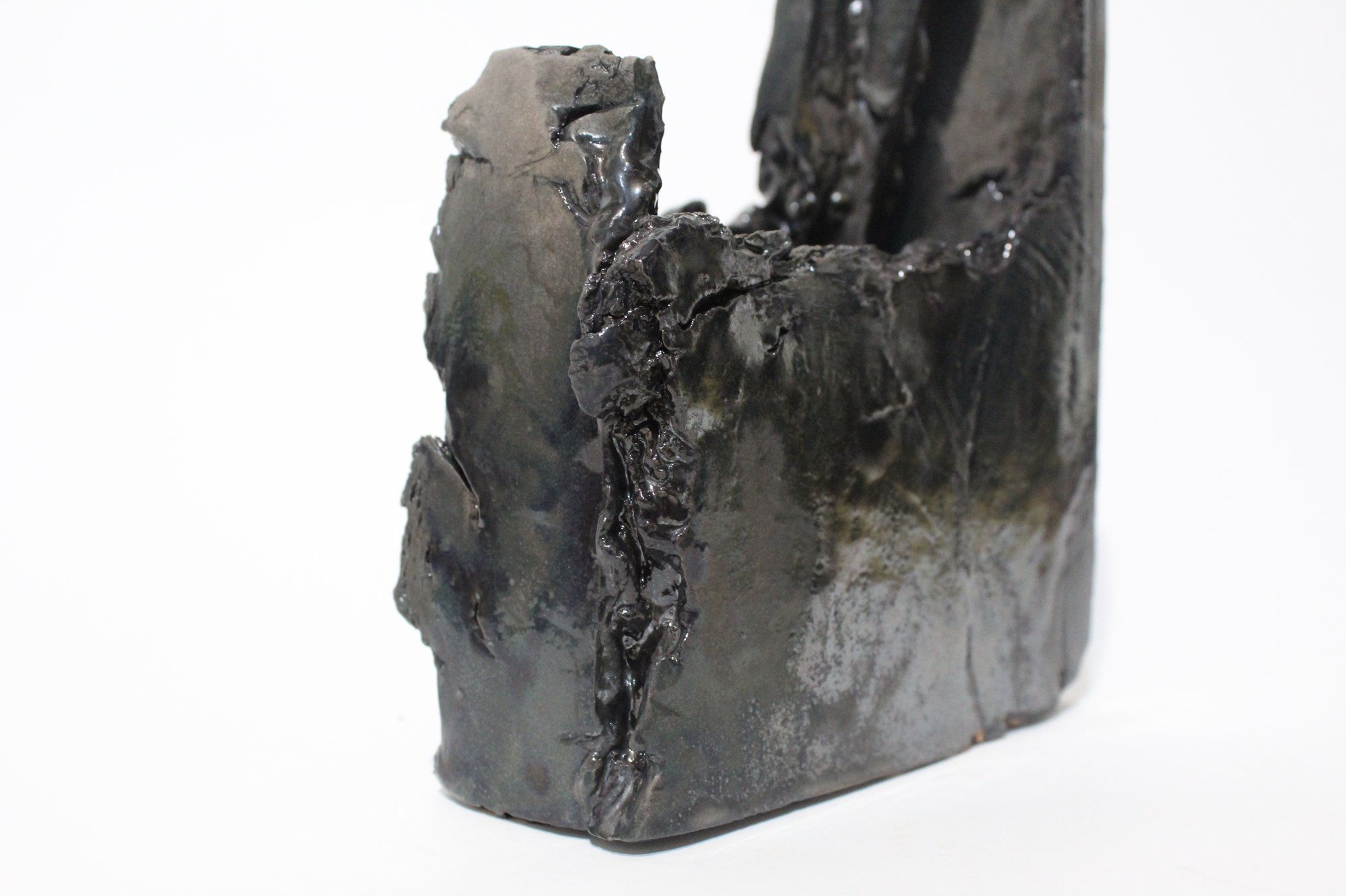 Scultura organica in ceramica smaltata nera, modellata a mano nel 2024. Le sue forme irregolari richiamano una roccia levigata dal tempo, con superfici opache che assorbono la luce e ne esaltano la presenza materica. Il pezzo, unico e non replicabile, esplora l’incontro tra solidità minerale e fragilità ceramica, offrendo una presenza essenziale e contemplativa nello spazio.